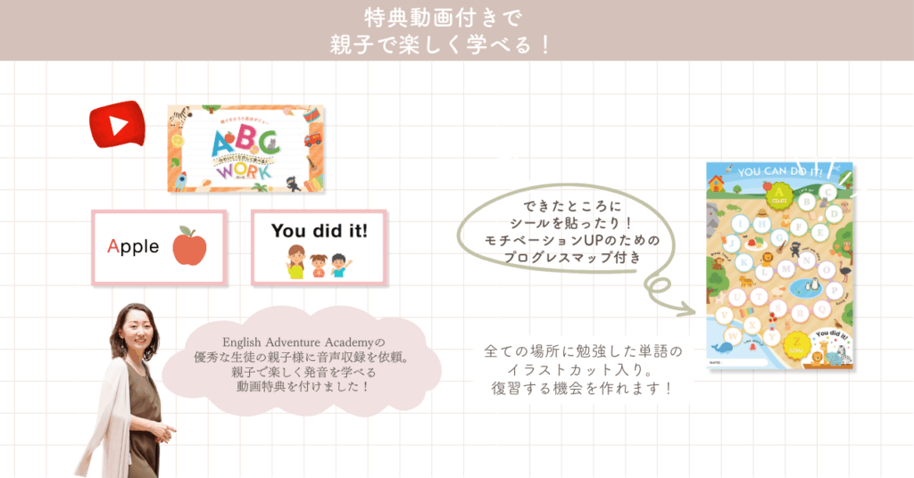 お子さんが楽しく、親子で安心して取り組めるアルファベット教材です。