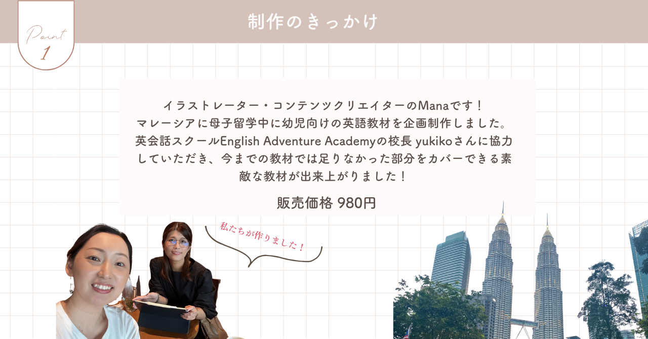 同じくマレーシアに来られていた英会話スクールEnglish Adventure Academyの校長 yukikoさんに協力していただき、今までの教材では足りなかった部分をカバーできる素敵な教材が出来上がりました!